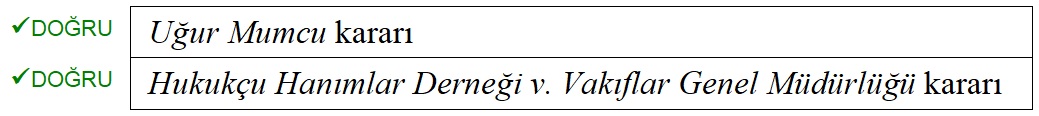 Kural 523.- Batı ülkelerinde kararlar, genellikle davanın taraflarının isimleriyle adlandırılır. Davacı ve davalının isimlerinin arasına Latince “karşı” anlamına gelen “versus” kelimesinin kısaltması olan “v.” harfi veya “vs.” harfleri konulur. “Marbury v. Madison kararı”, “Roe v. Wade kararı” gibi. Türkiye’de de kararlar bu şekilde tarafların isimleriyle adlandırılmalıdır. “Doğramacı v. Yazıcı kararı” gibi. Karar isimleri, yani taraf isimleri ve bu isimlerin arasındaki v. kısaltması italik yazılır. Ancak karar isminden sonra gelen “kararı” veya “davası” gibi kelimeler normal yazılır (s.653-654). Bir örnek: